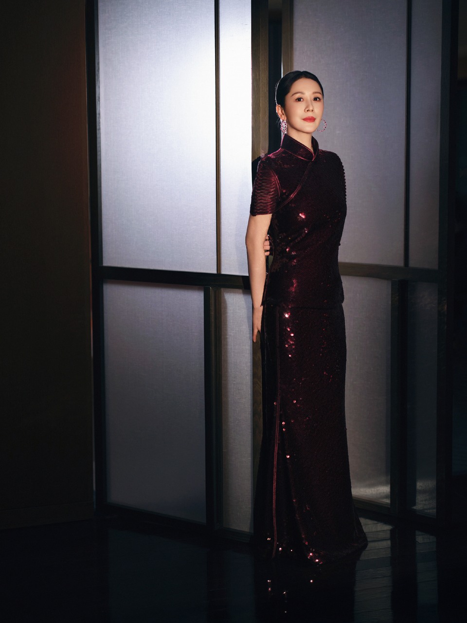 海清深酒红色亮片旗袍式长裙 勾勒出东方风骨