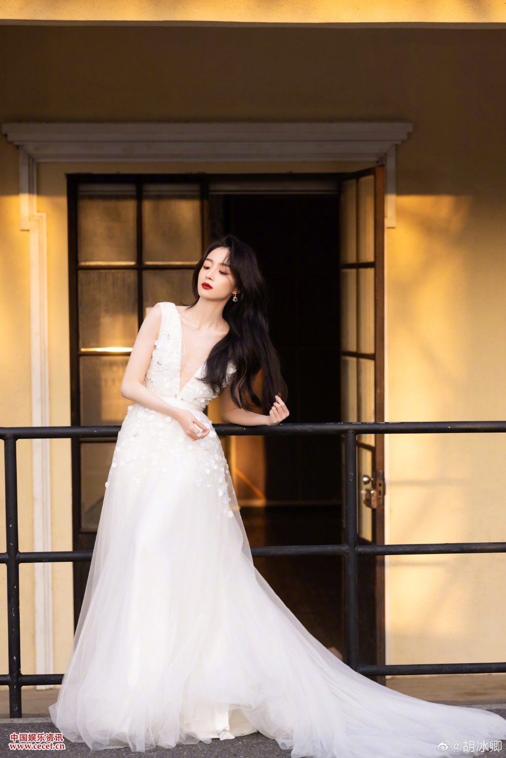 胡冰卿深V白纱长裙照 长卷发披肩端庄温婉