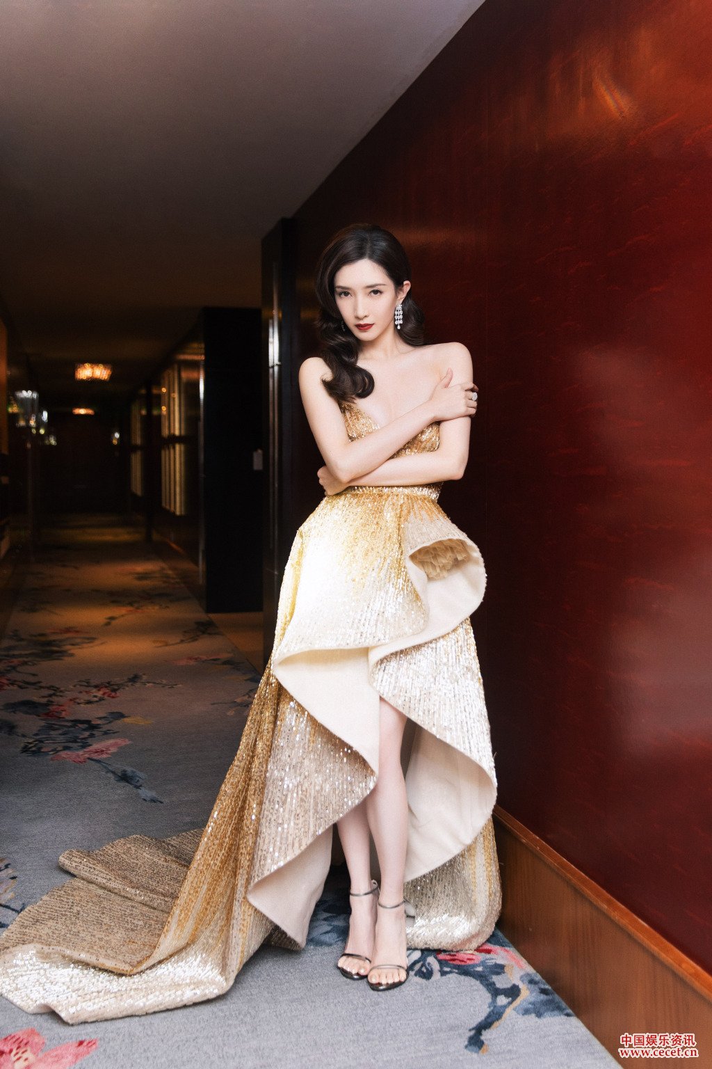 江疏影鎏金亮片礼服照 眼波潋滟流光洒在裙间