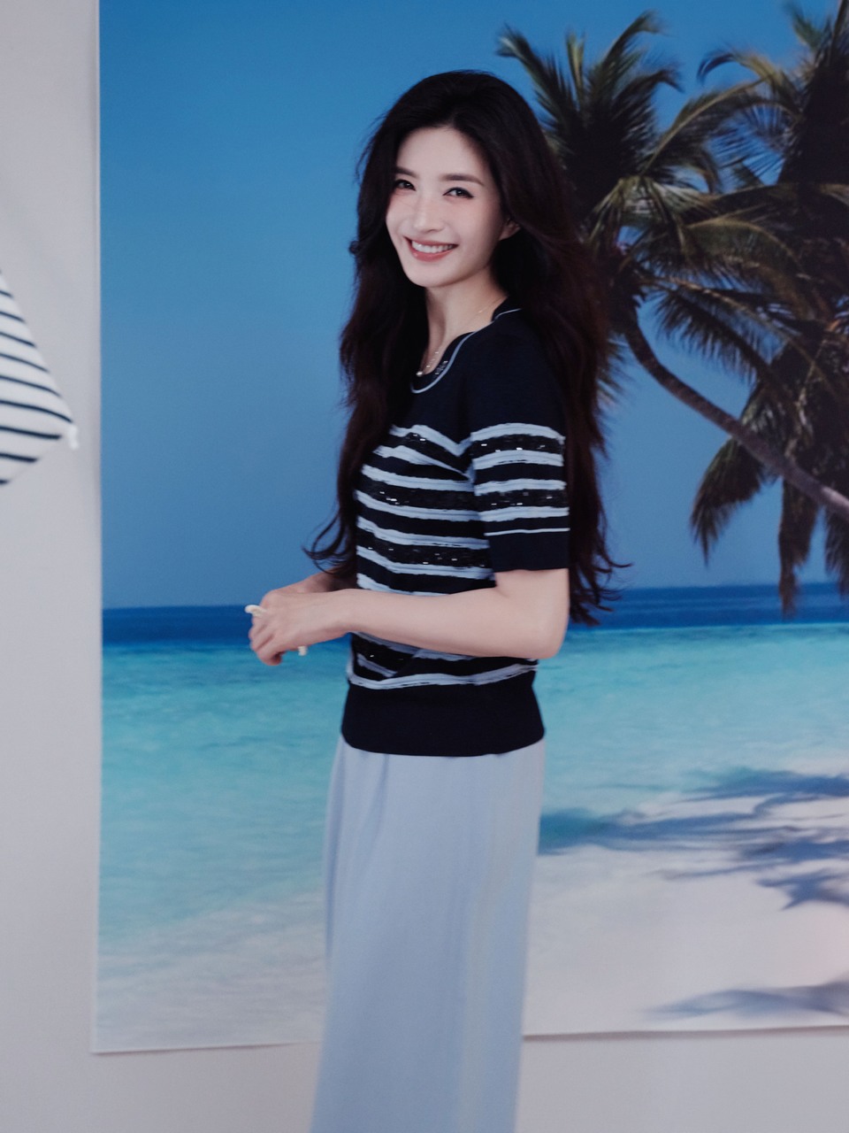 江疏影在蓝色条纹与背景画布的慵懒里自在