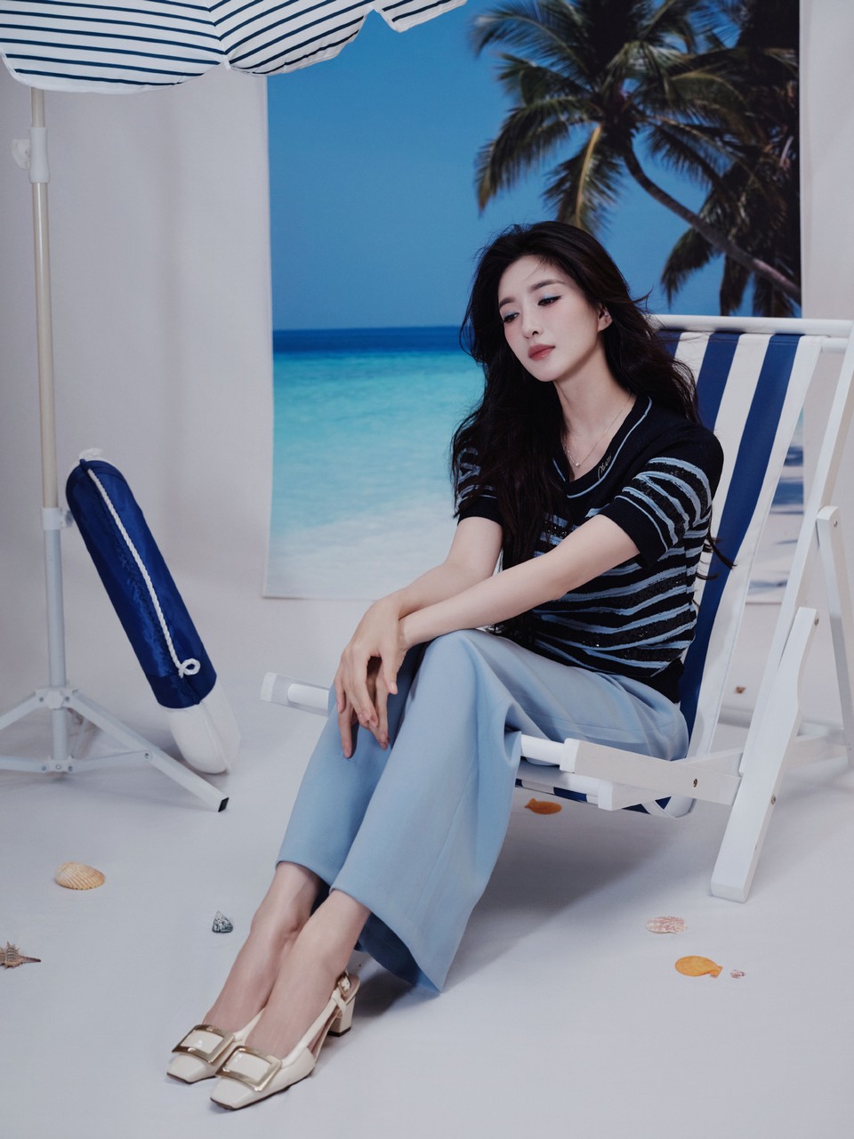 江疏影在蓝色条纹与背景画布的慵懒里自在