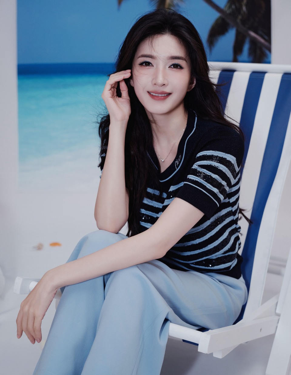 江疏影在蓝色条纹与背景画布的慵懒里自在