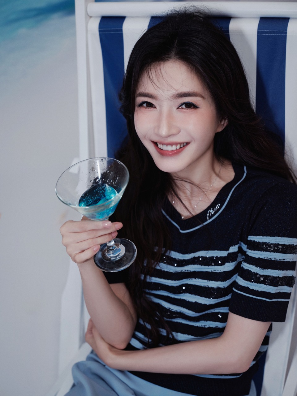 江疏影在蓝色条纹与背景画布的慵懒里自在