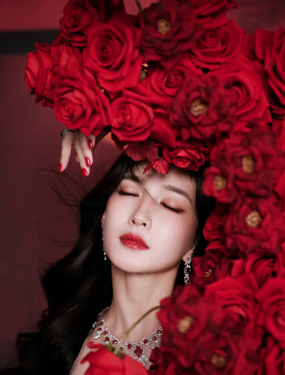 江疏影最迷人的主角 暗调背景里红玫瑰是唯一的光