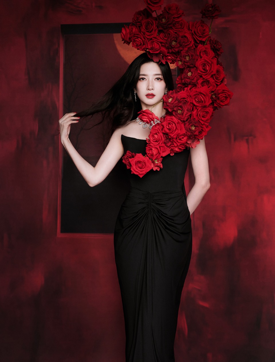 江疏影最迷人的主角 暗调背景里红玫瑰是唯一的光