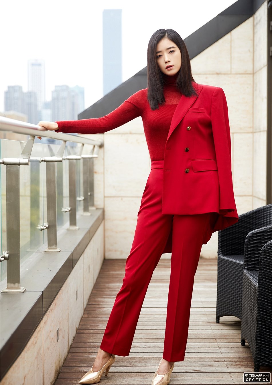 蒋欣红色系秋季写真 优雅干练的御姐气质