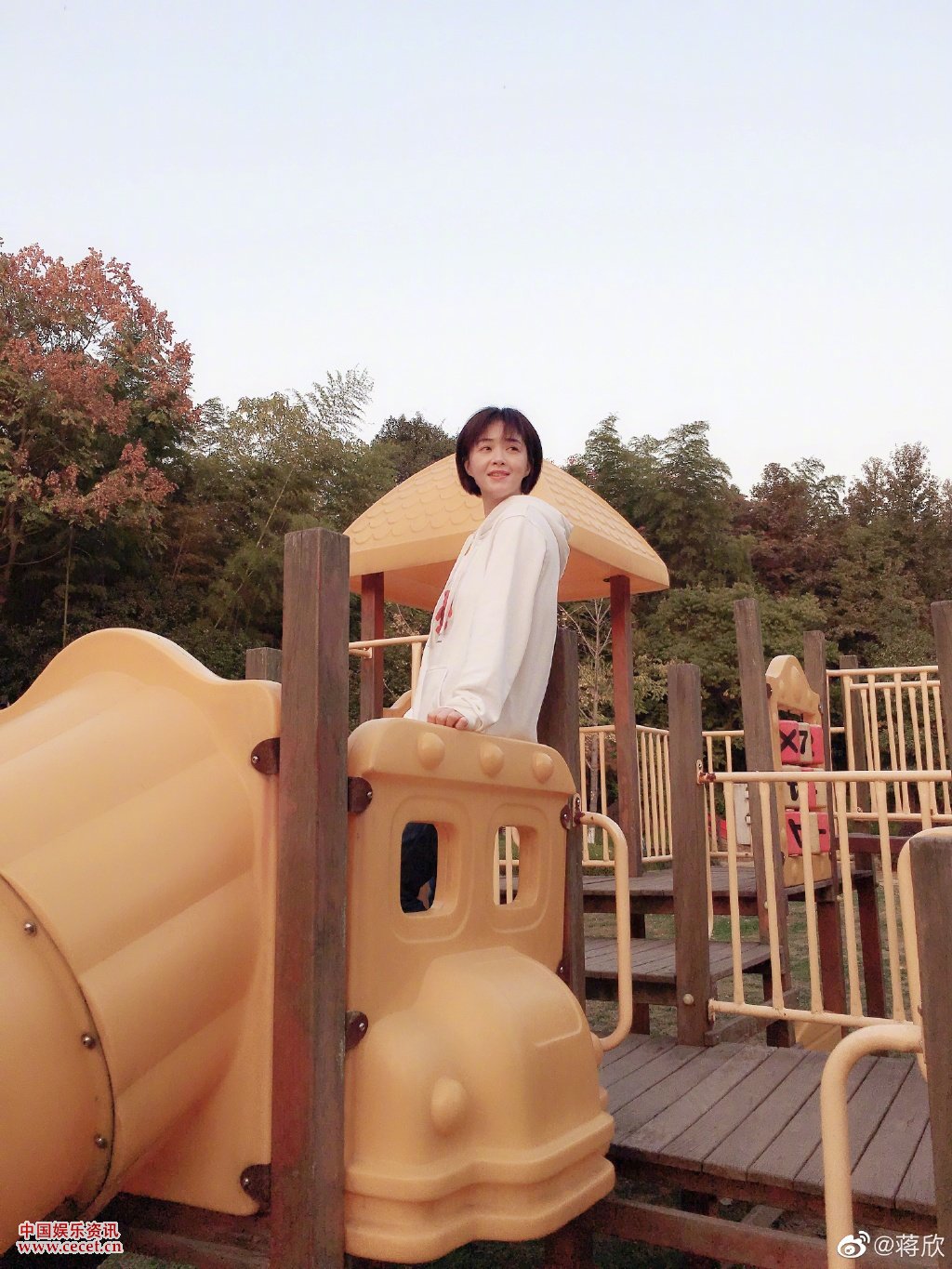 蒋欣公园游玩美照 熊孩子一样调皮童心依旧