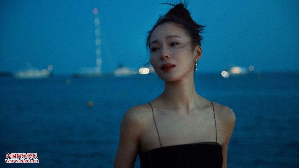 江一燕置身静谧海边 黑色吊带长裙简约优雅