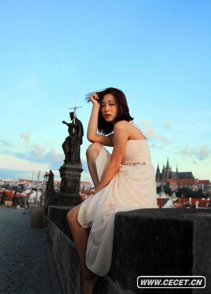 江一燕露肩长裙清新淡雅 迷情布拉格街头