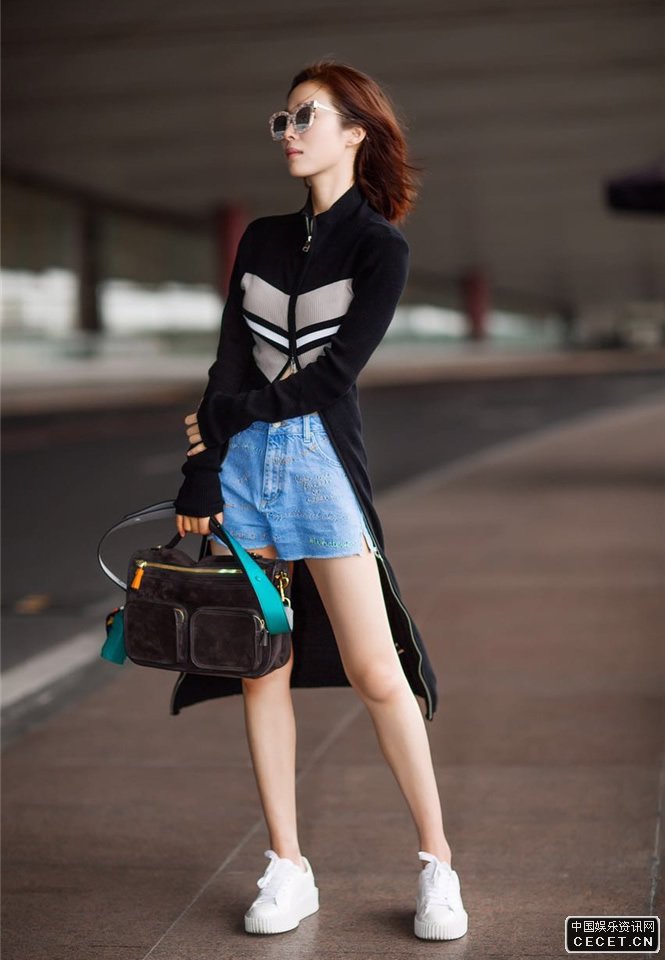 江一燕曝光机场街拍 飘逸露脐装加热裤出镜