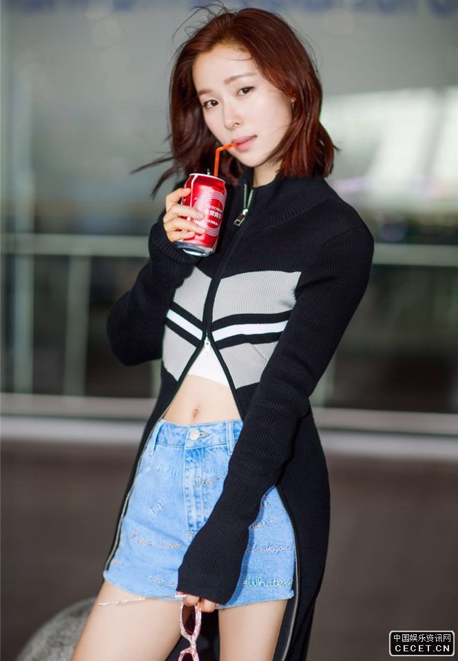 江一燕曝光机场街拍 飘逸露脐装加热裤出镜
