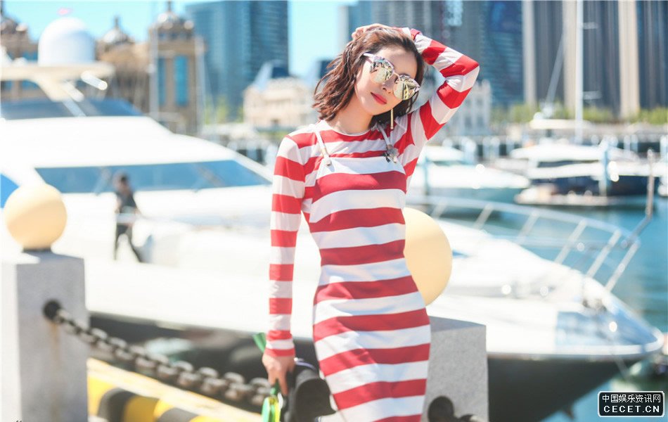 江一燕秋日度假风写真 红白条纹富有青春活力