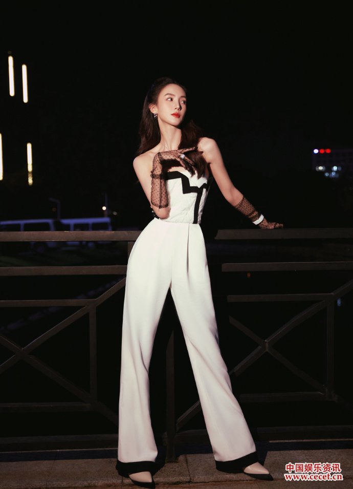 金晨白色系连体装搭配黑蕾丝手套尽显优雅气质