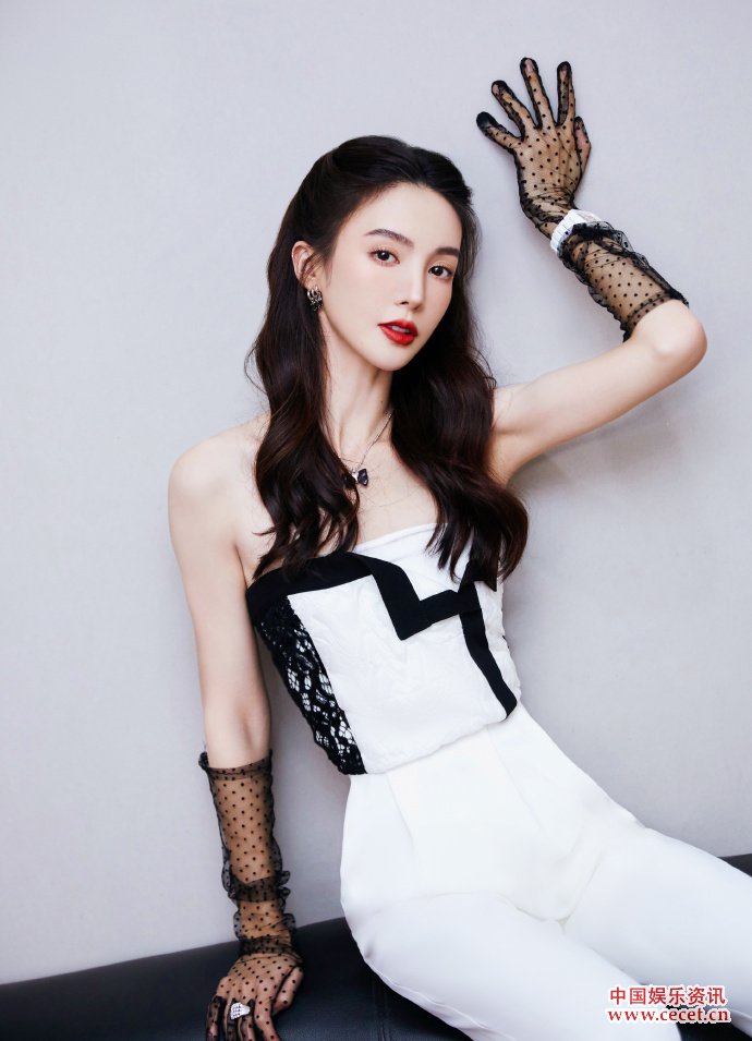 金晨白色系连体装搭配黑蕾丝手套尽显优雅气质
