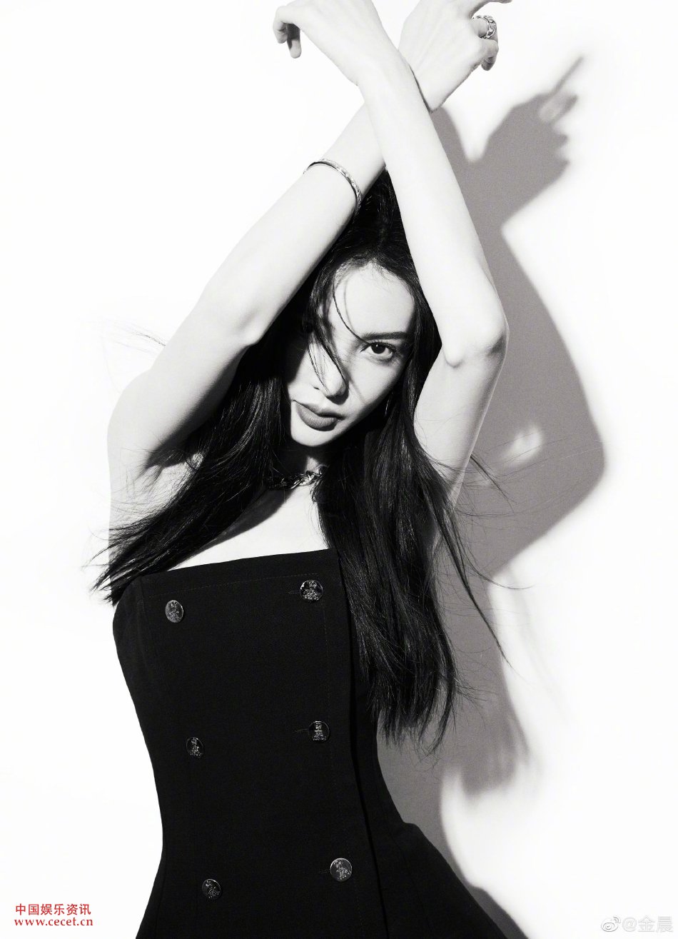 金晨身穿黑色抹胸上衣秀优越肩颈线条酷飒十足