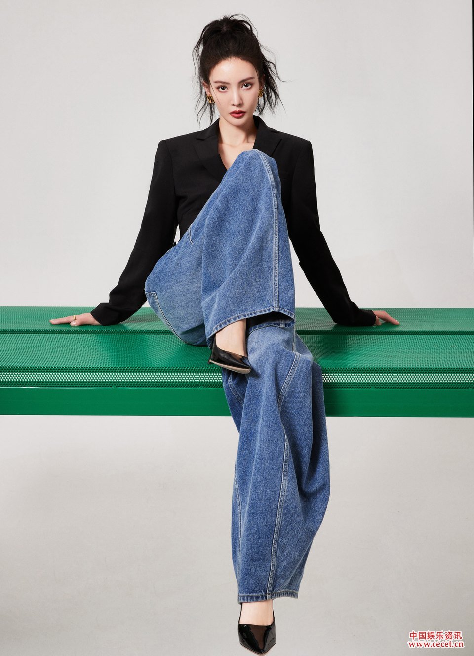 金晨宽松牛仔简约复古 高马尾发型率性自如