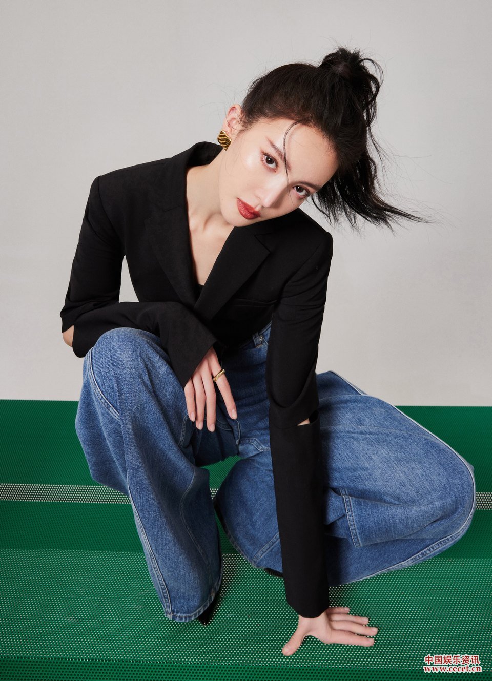 金晨宽松牛仔简约复古 高马尾发型率性自如