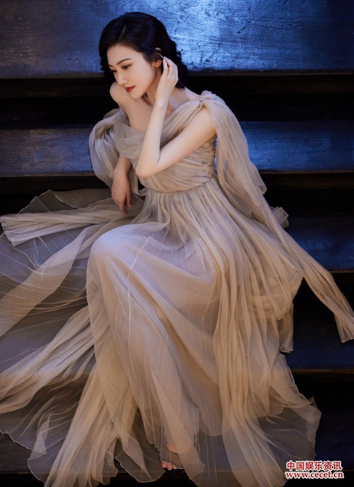 景甜楼梯大片 身穿粉色系带长裙十分仙气飘飘