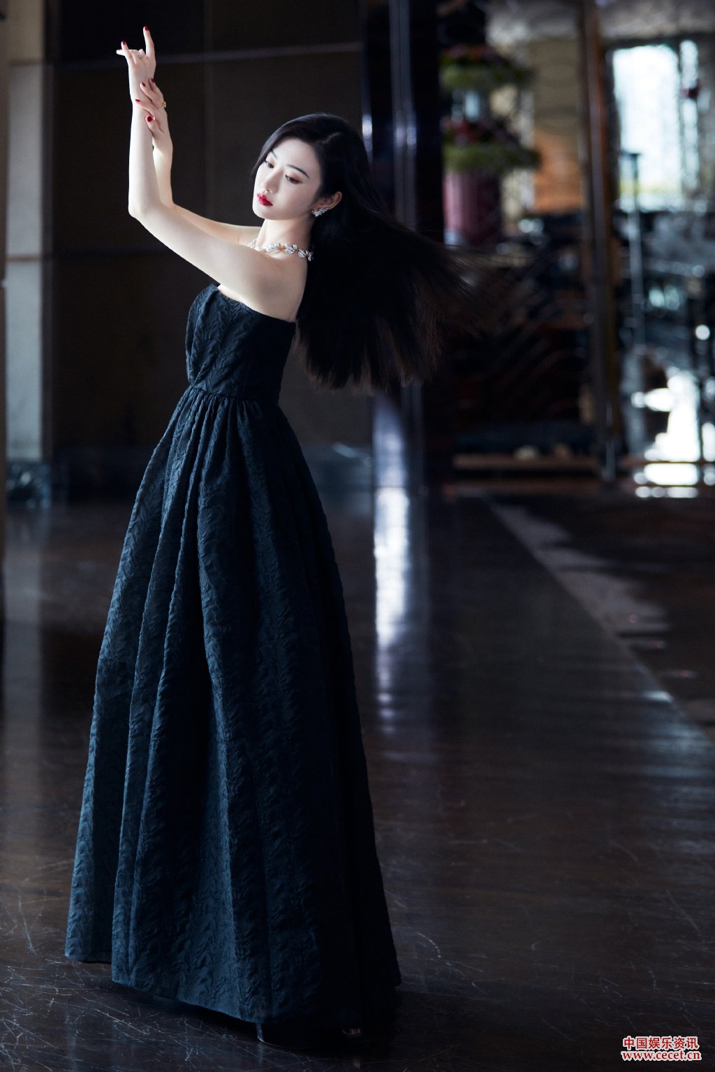 景甜黑色抹胸裙 擢纤纤之素手雪皓腕而露形