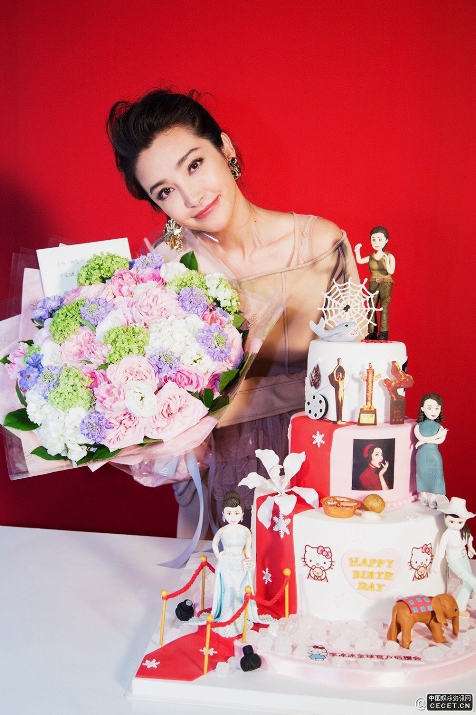 李冰冰生日捧花甜笑 粉丝送蛋糕附Q版人偶