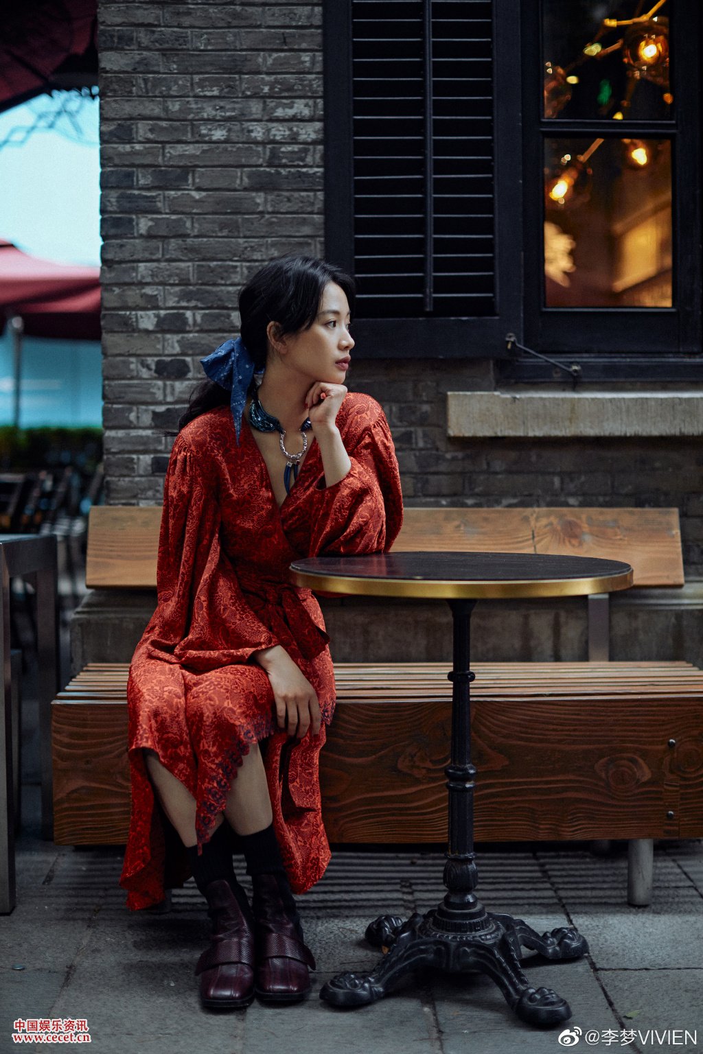 李梦大红长裙街拍美照 高雅的姿态慵懒随性
