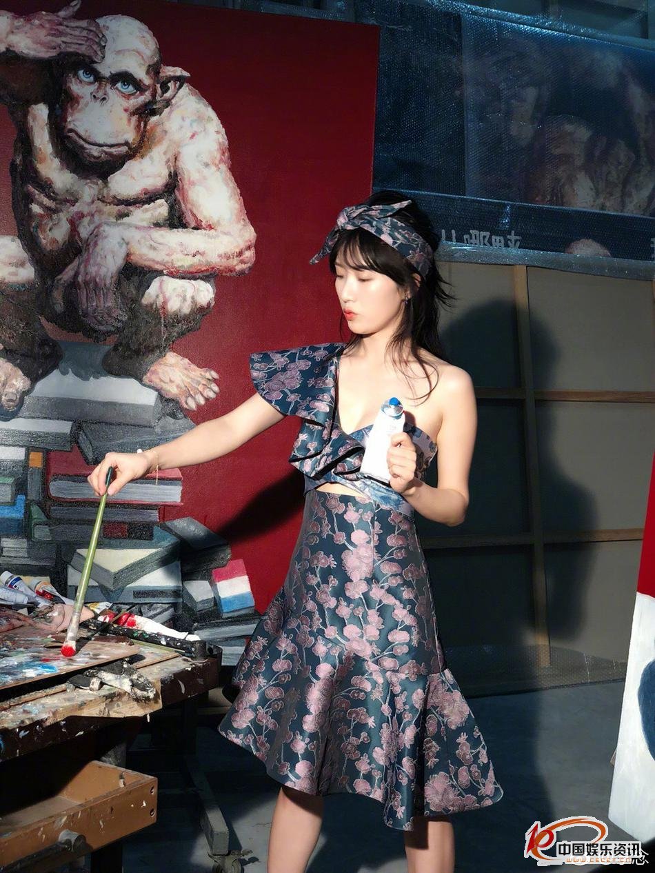 李念露肩碎花连衣裙照 笑起来的模样甜美可人