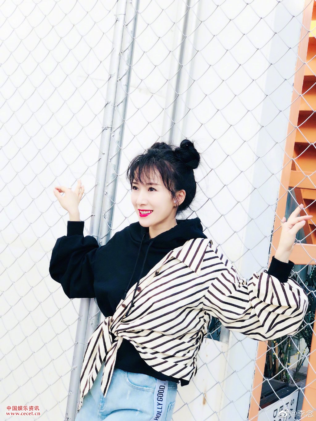 李念双丸子头清新造型 大秀纤细白皙美腿