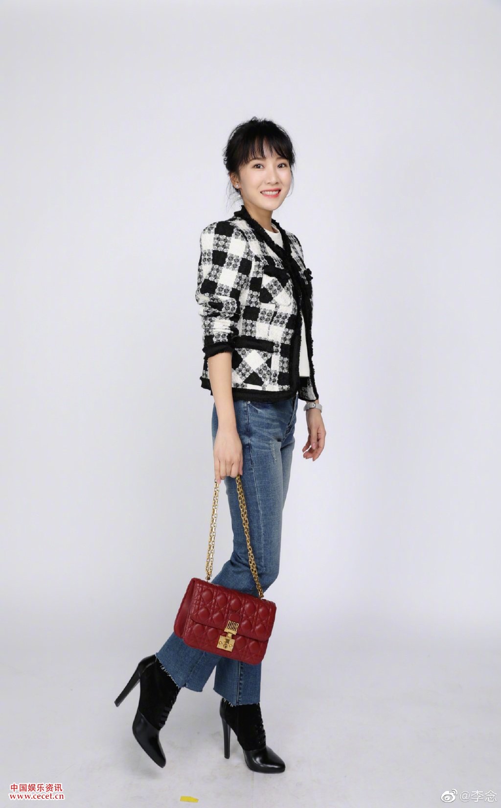 李念格子外套搭配牛仔裤一抹明媚释放春日灿烂