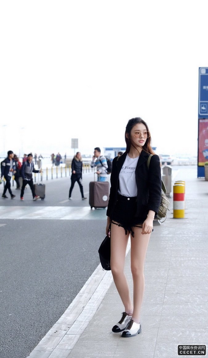 林允机场街拍照 黑衣短裤造型更是大秀美腿