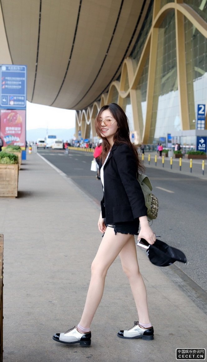 林允机场街拍照 黑衣短裤造型更是大秀美腿
