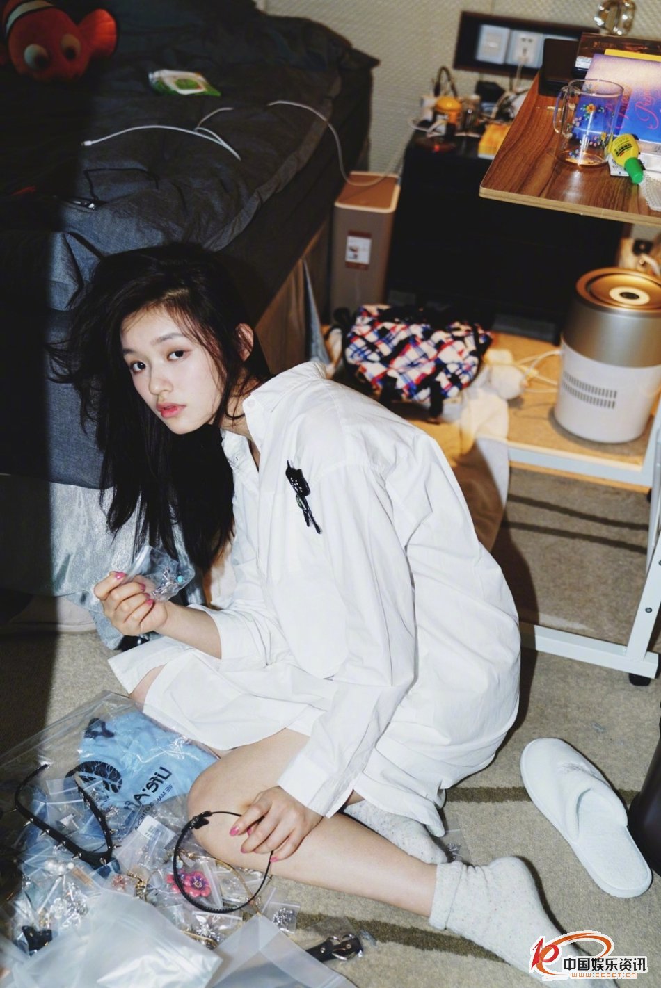 林允自家中身着白衬衫长发披肩一双长腿瞩目