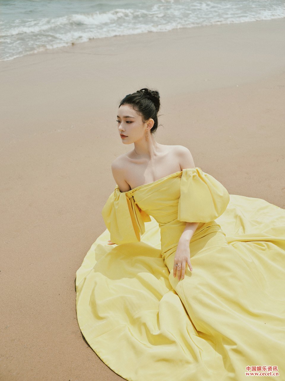 林允温柔暖黄色拖尾裙 尽情享受阳光与海风
