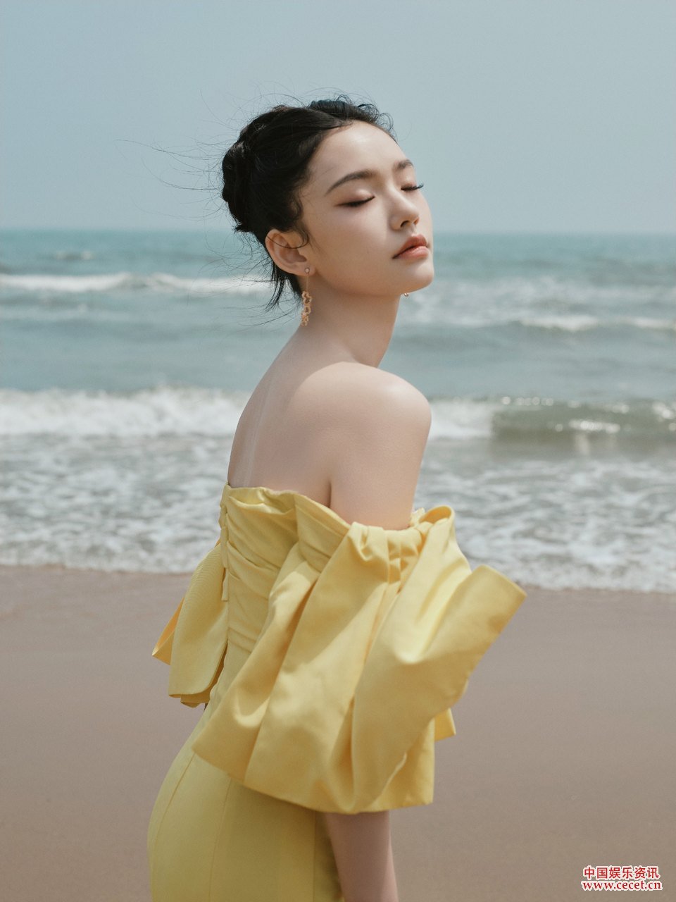 林允温柔暖黄色拖尾裙 尽情享受阳光与海风