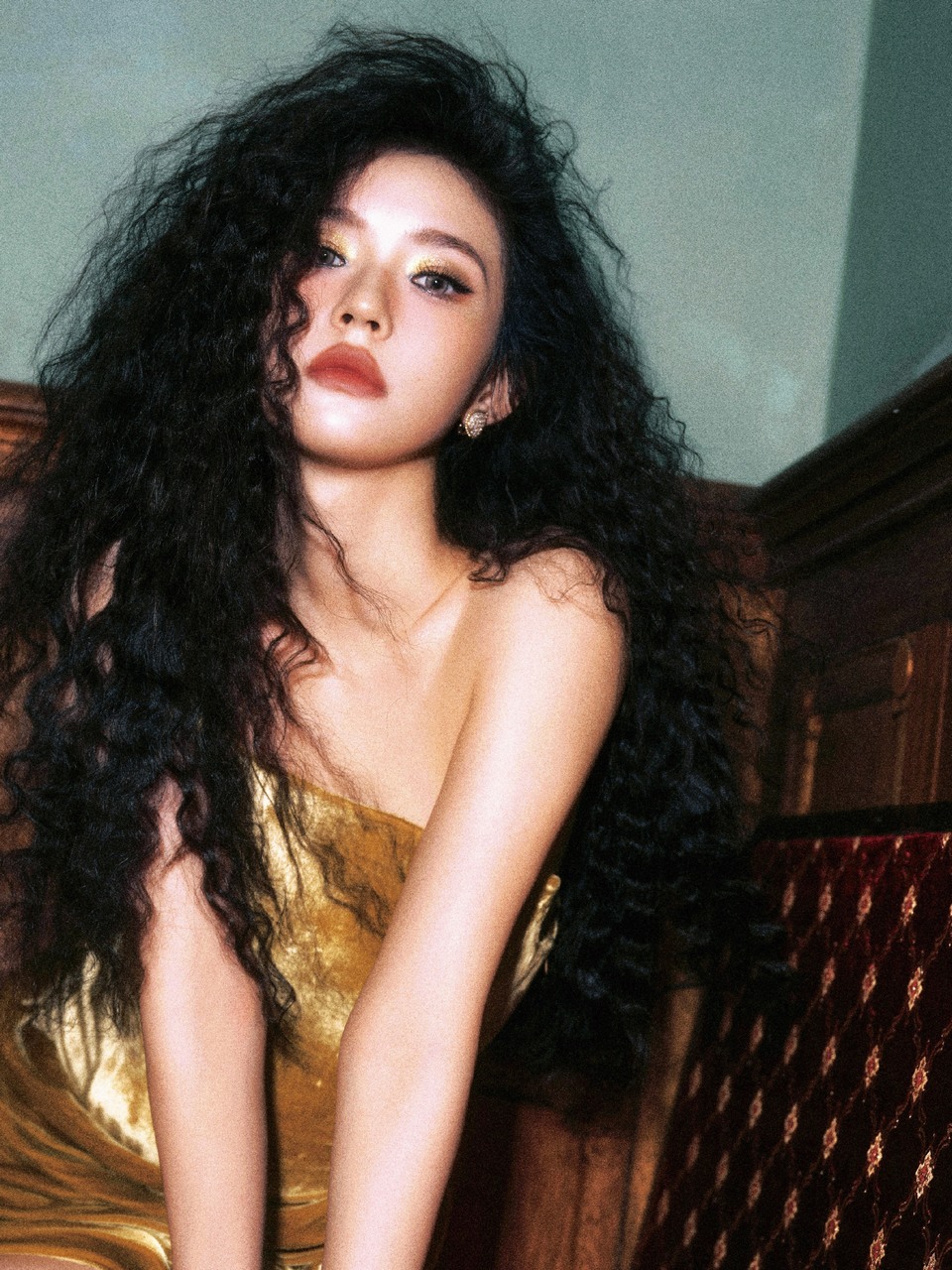 秦岚一袭金色长裙融于古典画镜