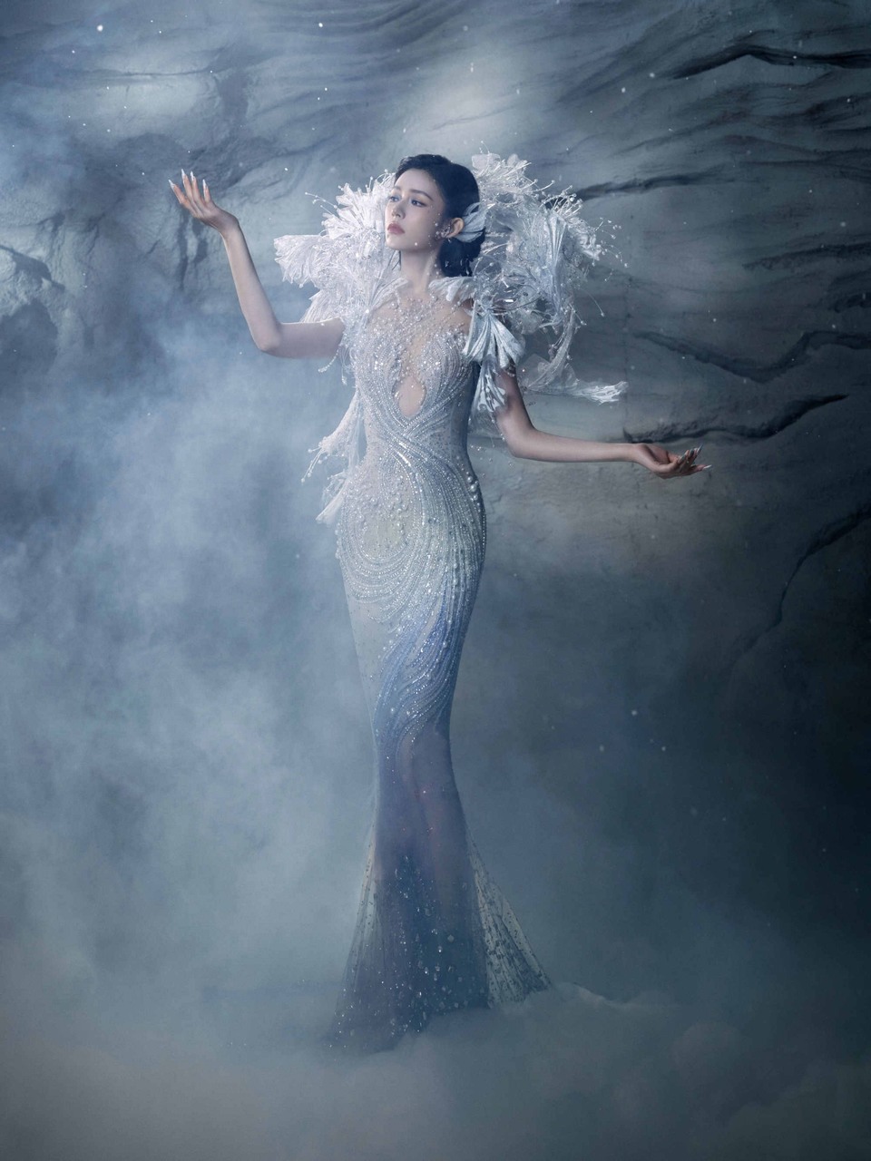 林允身影在雪雾中重叠出闪烁的辉光 雪花折射银白真心