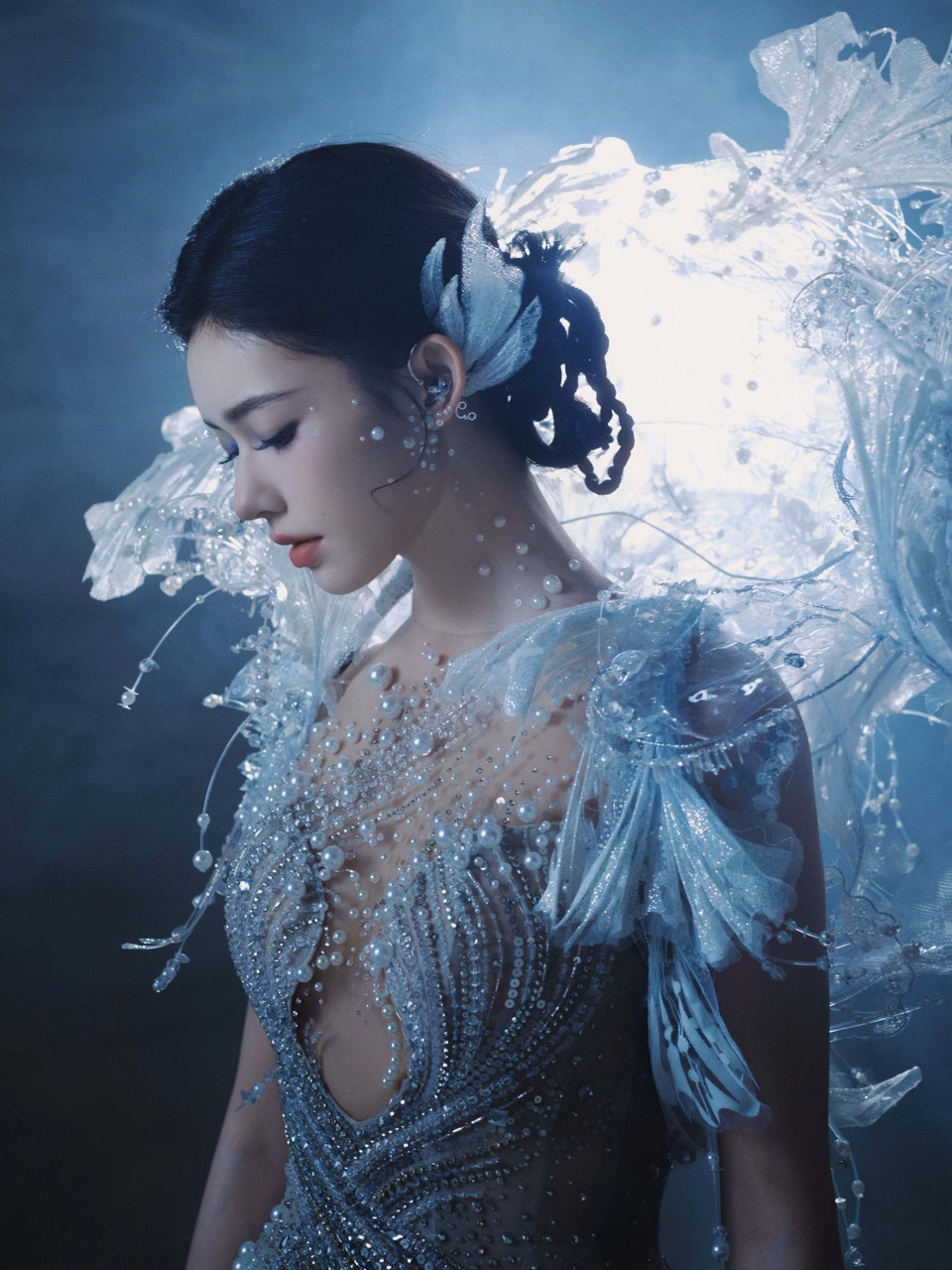 林允身影在雪雾中重叠出闪烁的辉光 雪花折射银白真心
