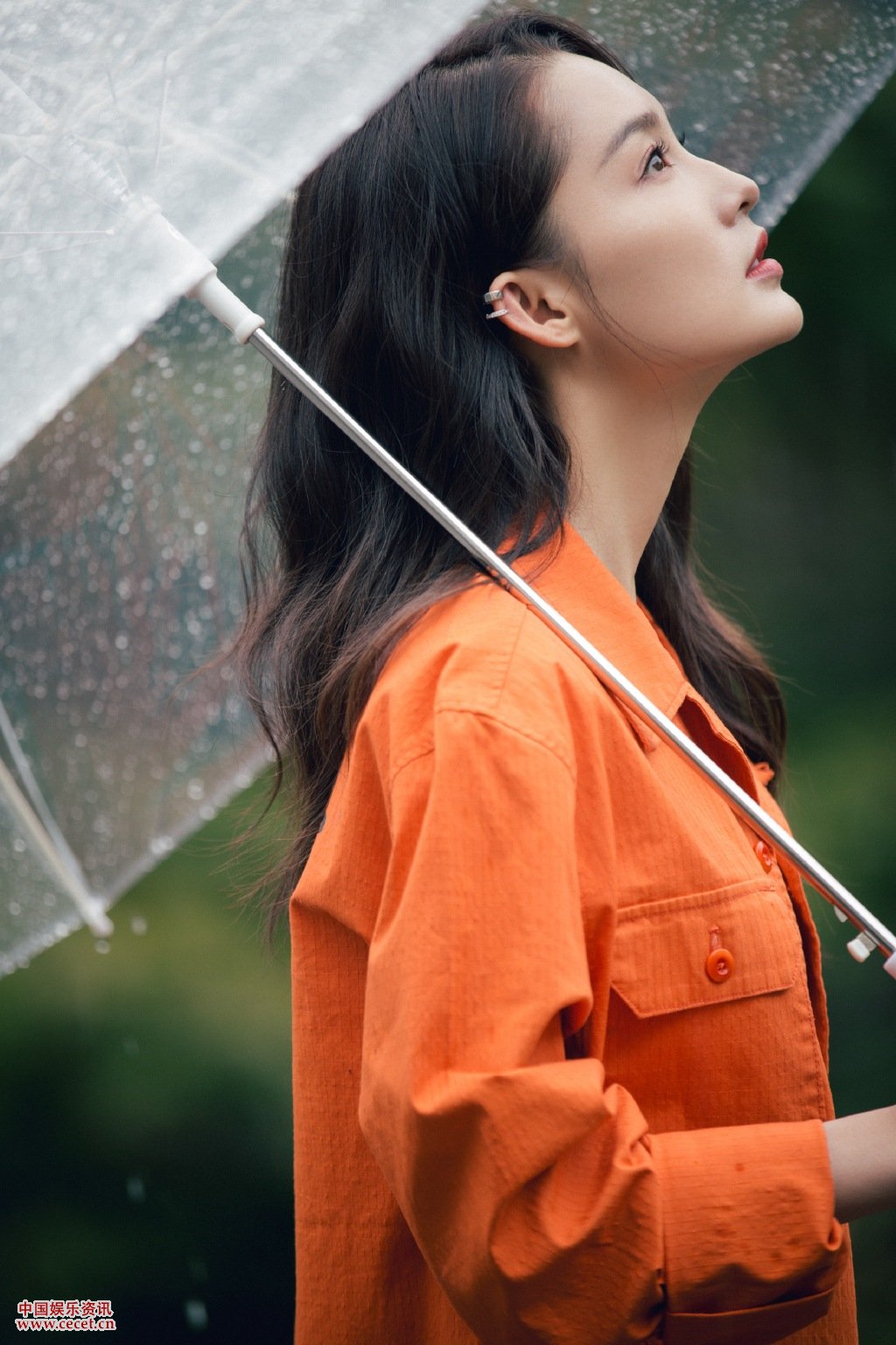 李沁橙色外套工装风 森林里的甜酷橘系少女