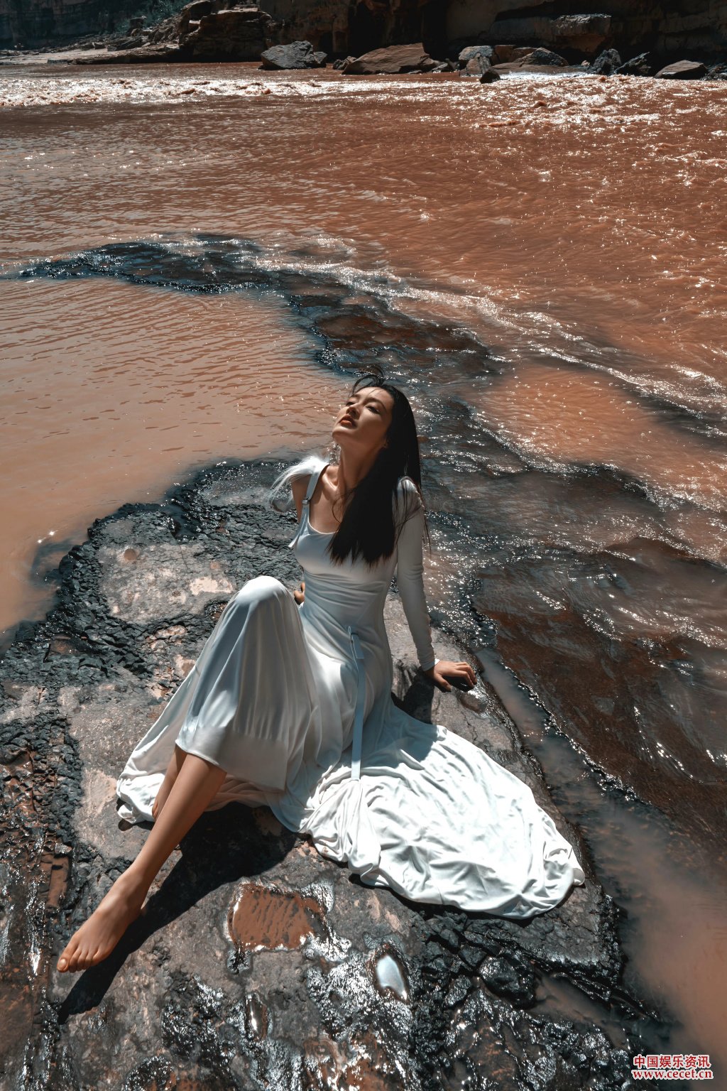 李沁长裙置身于河滩中 经典演绎纯洁的白
