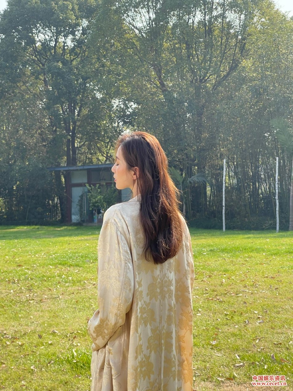刘诗诗春意草地写真 米黄色印花套装温柔优雅