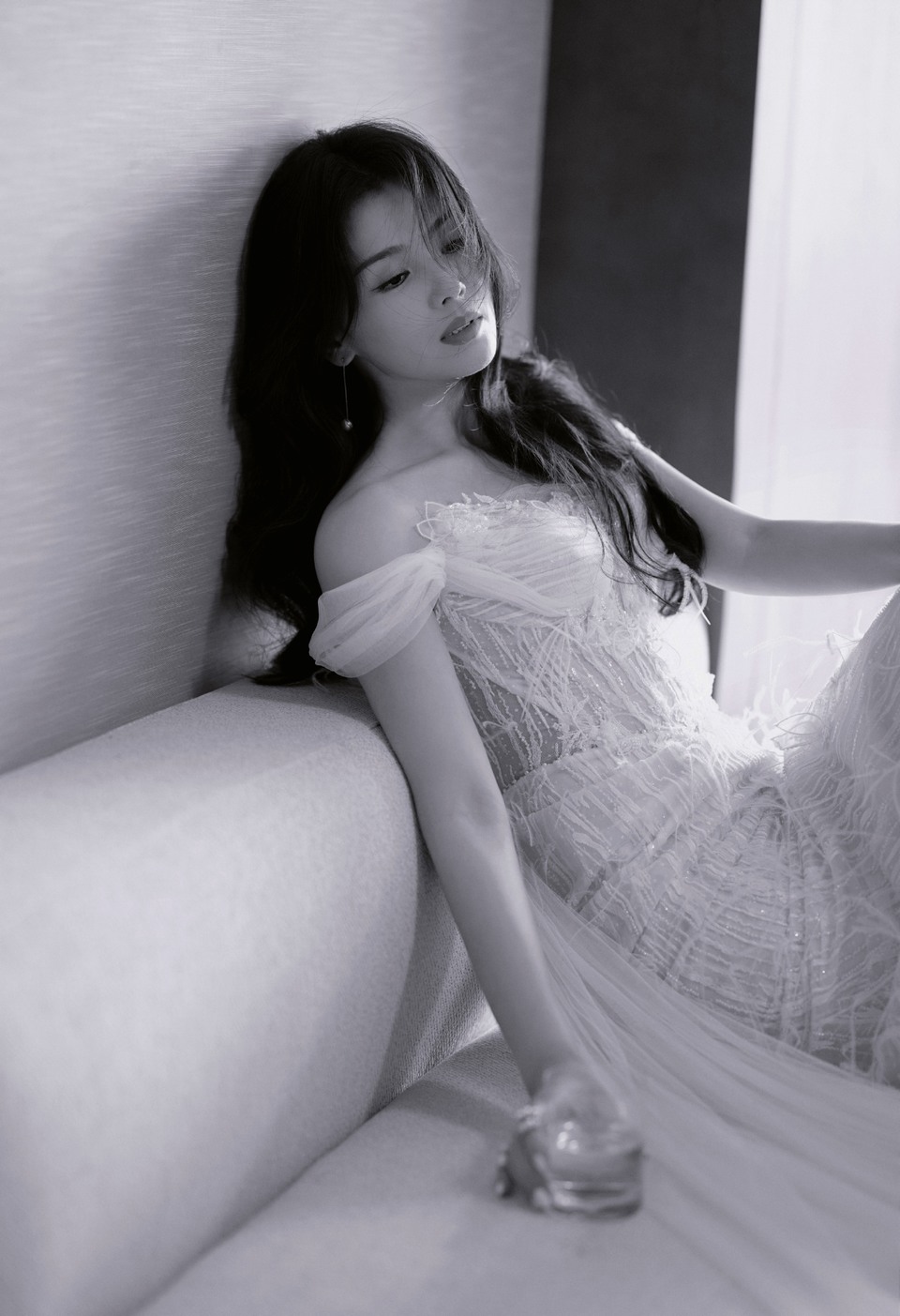 刘涛白色羽毛裙 发丝与轻纱共舞随“桃”羽裙轻扬