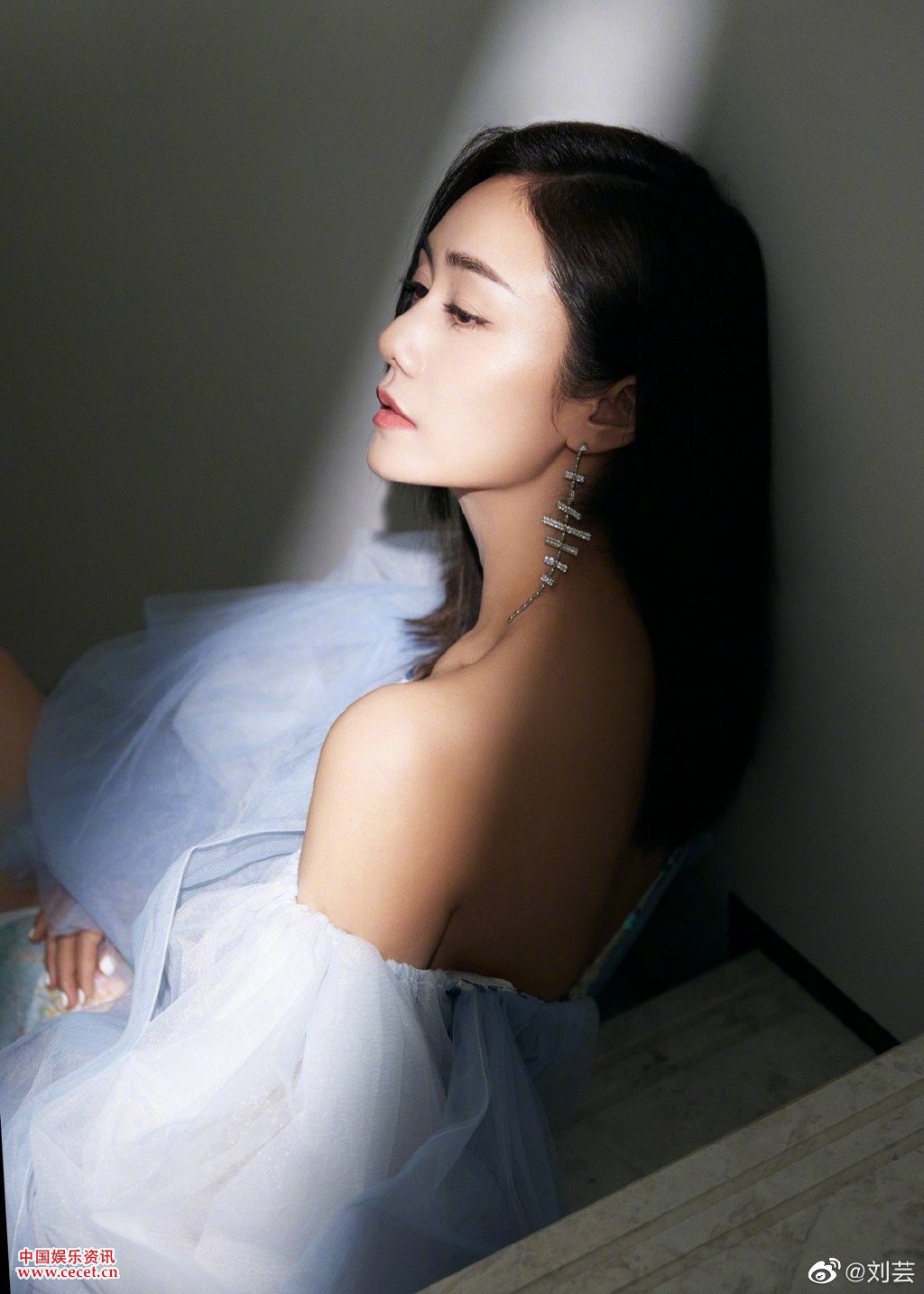 刘芸一字裙高开叉长裙 白嫩香肩干练大方