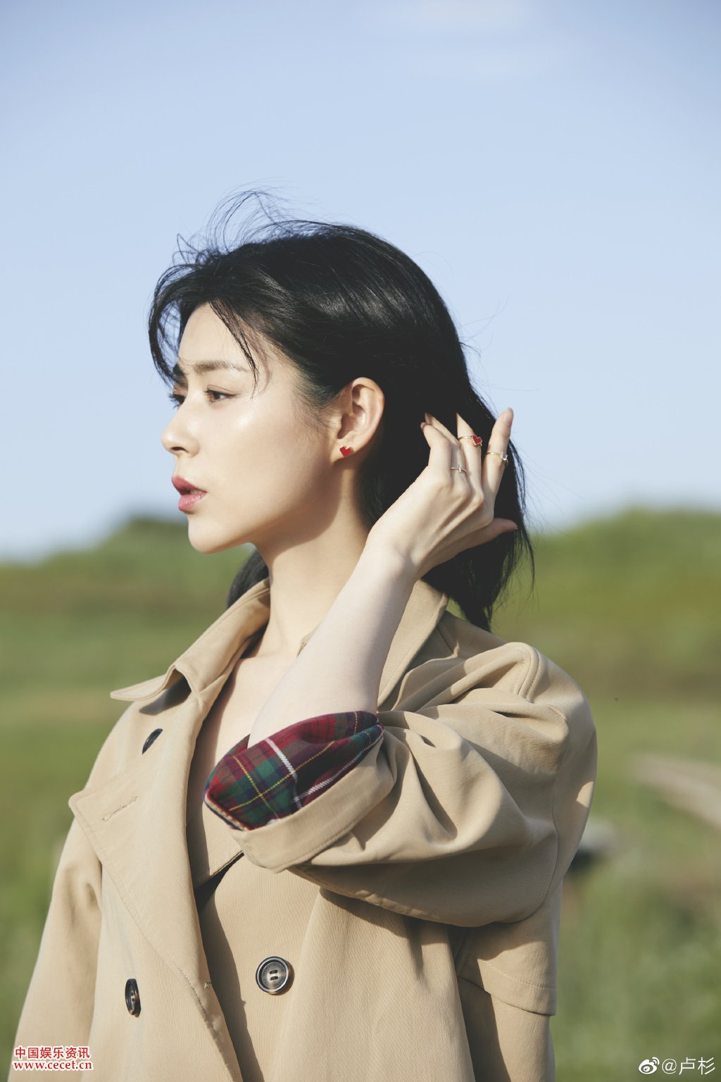 卢杉拍摄米色风衣大片 精致的五官优雅知性