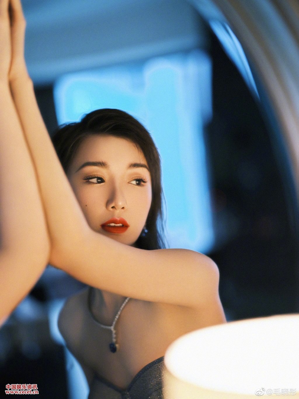 毛晓彤星空蓝闪钻抹胸裙 星光交错定格魅力瞬间
