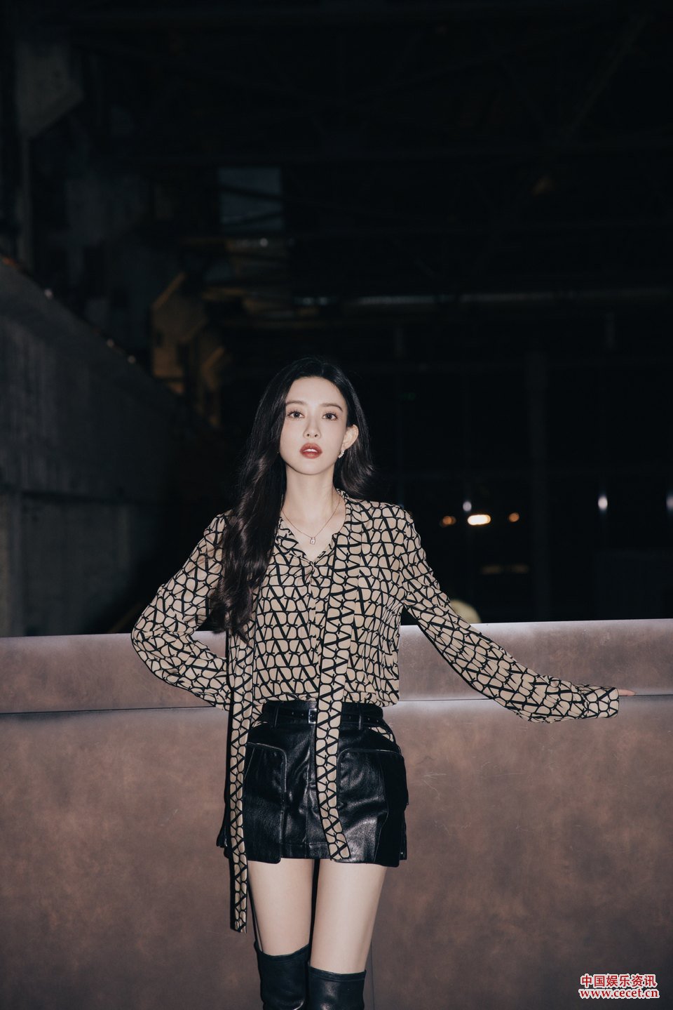 孟子义身穿丝绸衬衫搭配皮质黑色短裙飒飒生风
