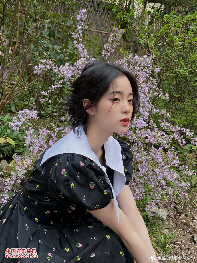 欧阳娜娜春日九宫格 穿黑色碎花裙妆容粉嫩