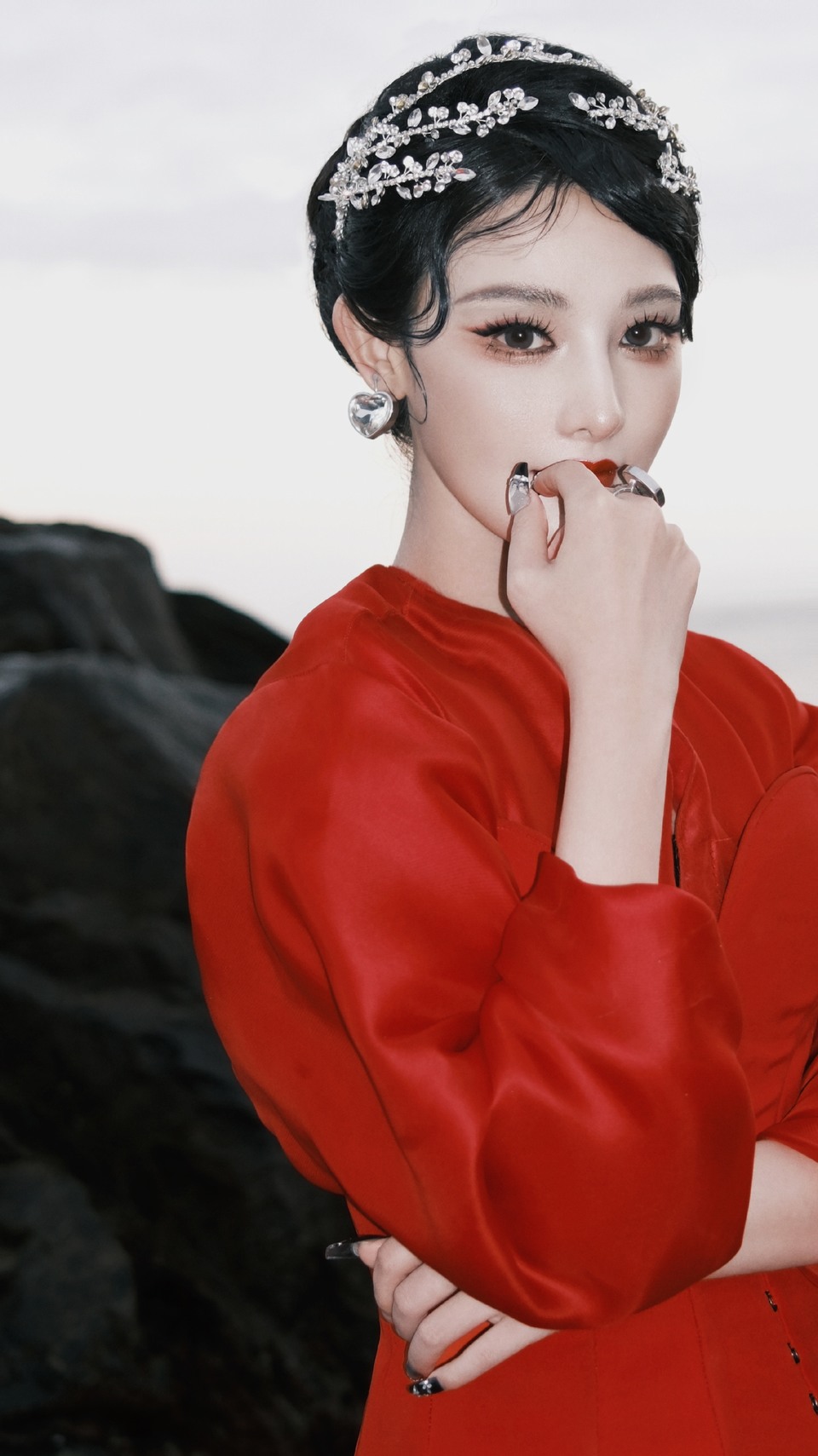 彭小苒海风轻拂红装摇曳 艳丽红衣晕染海岸绮梦