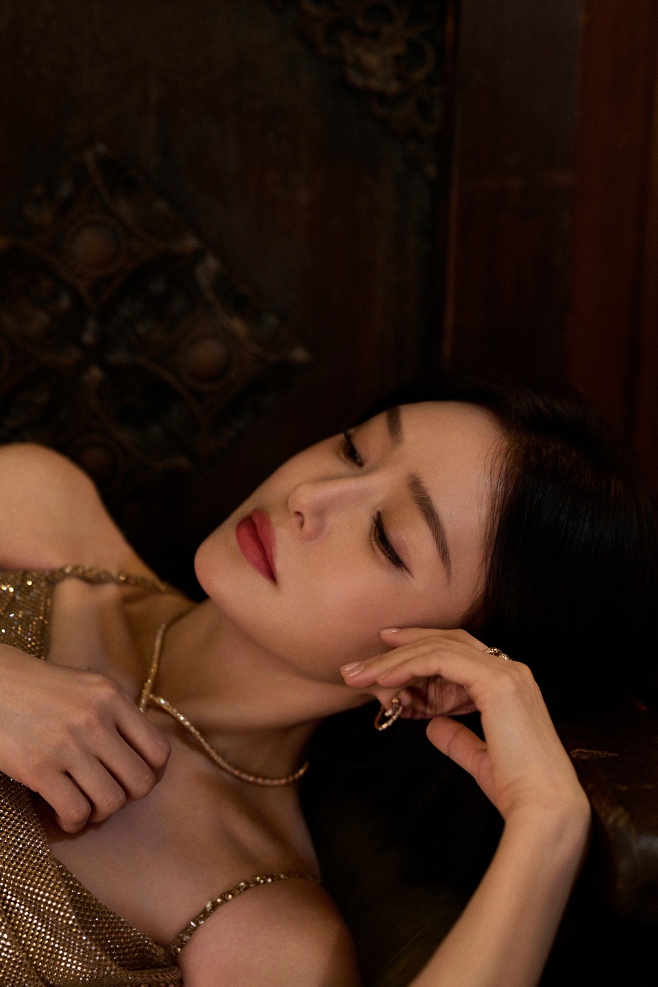 秦岚一袭金色长裙融于古典画镜 尽显缱绻优雅