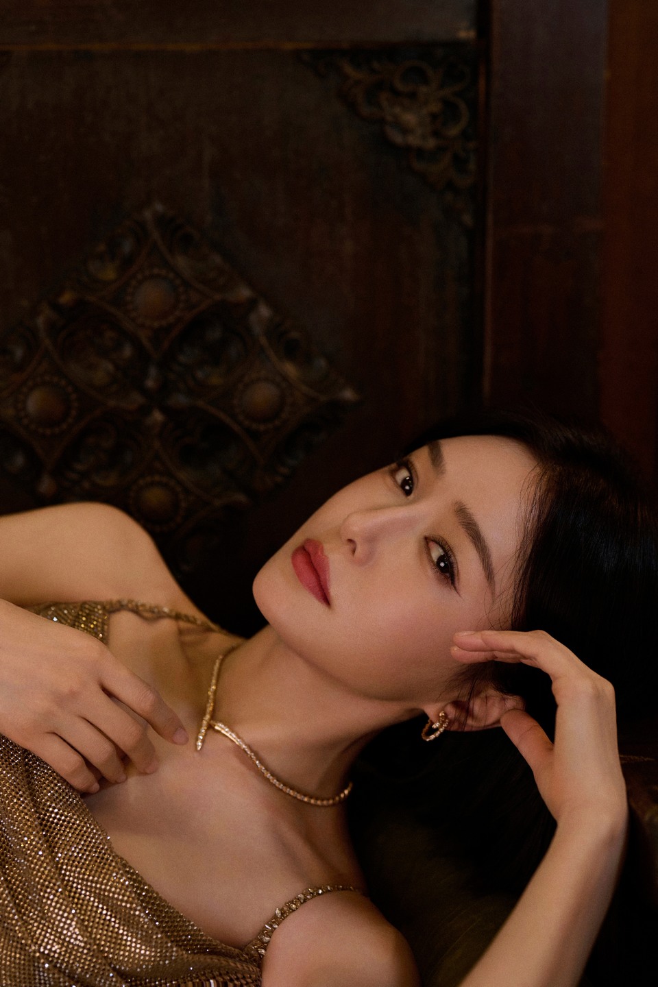 秦岚一袭金色长裙融于古典画镜 尽显缱绻优雅