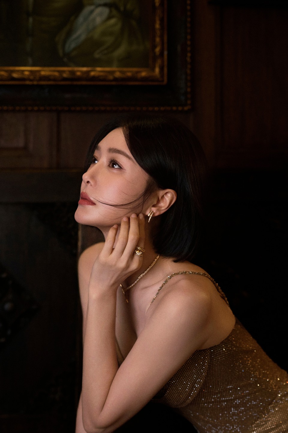 秦岚一袭金色长裙融于古典画镜 尽显缱绻优雅