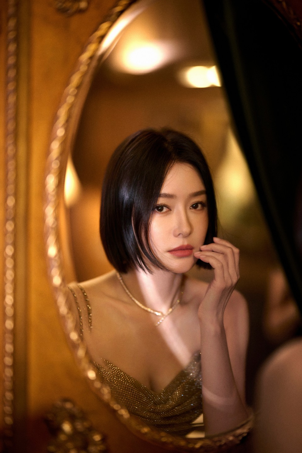 秦岚一袭金色长裙融于古典画镜 尽显缱绻优雅